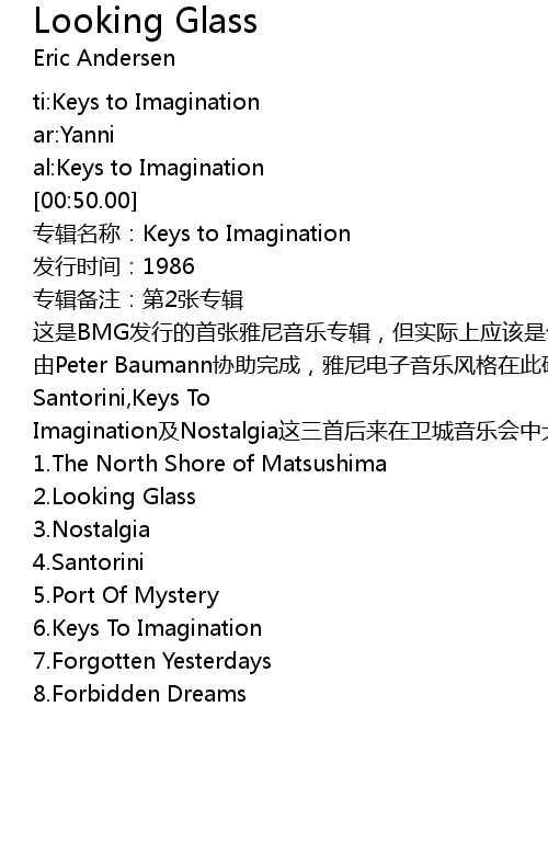 | [03:00.00] | Santorini,Keys To Imagination及Nostalgia这三首后来在卫城音乐会中大放光彩的作品最初均收录于此。 |