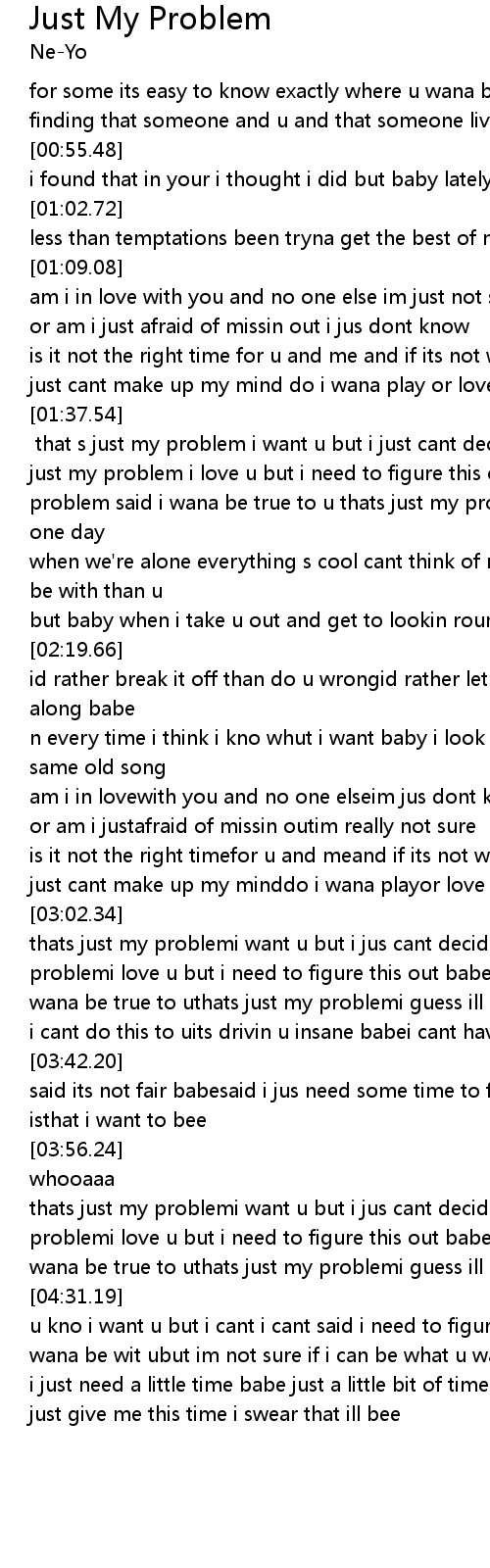 [01:38.10] that s just my problem i want u but i just cant decide babe that s just my problem i love u but i need to figure this out babe thats just my problem said i wana be true to u thats just my problem i guess ill get it right one day