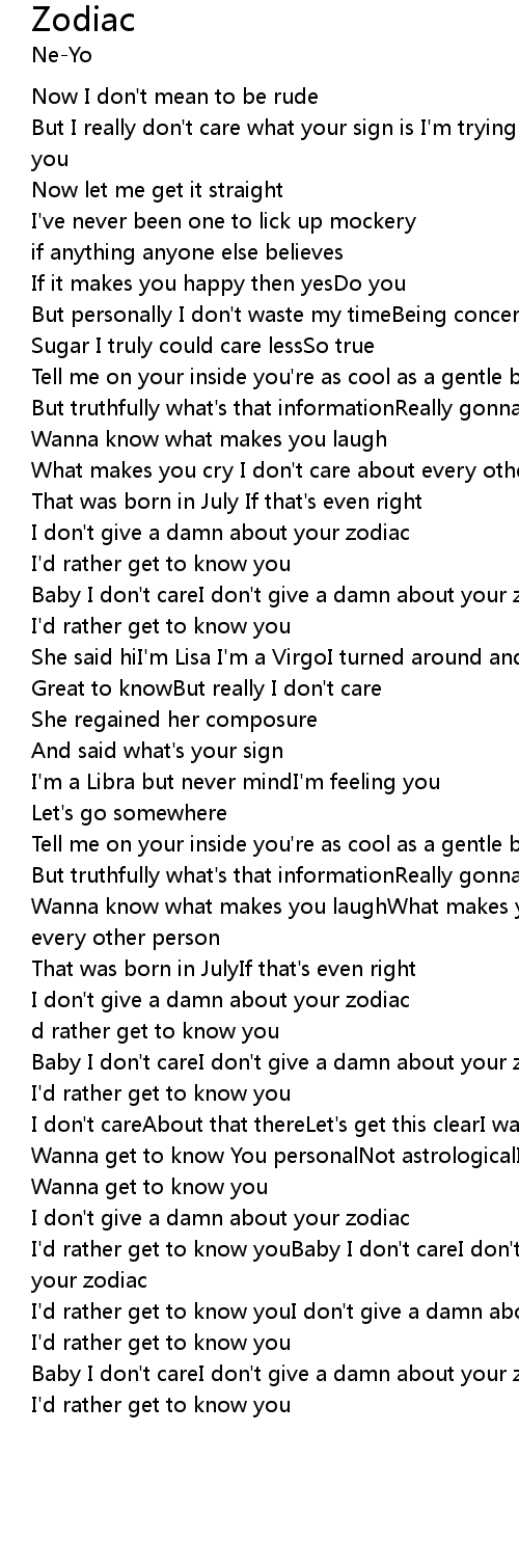 I'd rather get to know youBaby I don't careI don't give a damn about your zodiac |