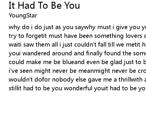 why do i do just as you saywhy must i give you your waywhy do i sigh why don't i try to forgetit must have been something lovers call fatekept saying i had to waiti saw them all i just couldn't fall till we metit had to be you it had to be youi wandered around and finally found the somebody whocould make me be true could make me be blueand even be glad just to be sad thinking of yousome others i've seen might never be meanmight never be cross or try to be bossbut they wouldn't dofor nobody else gave me a thrillwith all your faults i love you stillit had to be you wonderful youit had to be you |