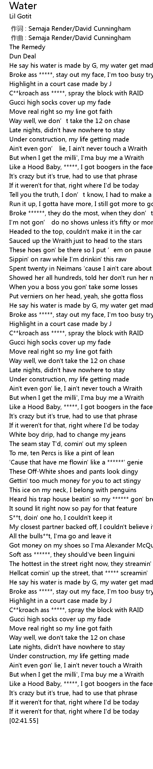 | [02:30.36] | But when I get the milli', I'ma buy me a Wraith |