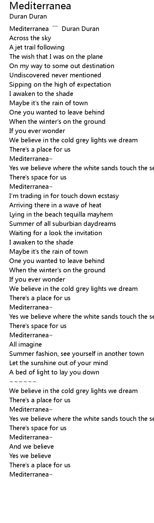 | [00:09.95] | Mediterranea ―― Duran Duran |