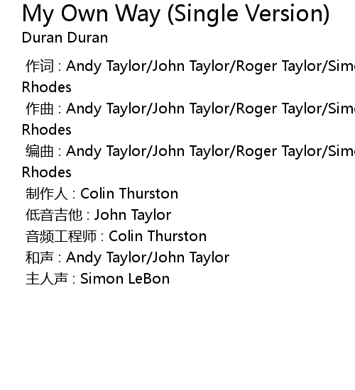 | [00:00.000] | 编曲 : Andy Taylor/John Taylor/Roger Taylor/Simon LeBon/Nick Rhodes |