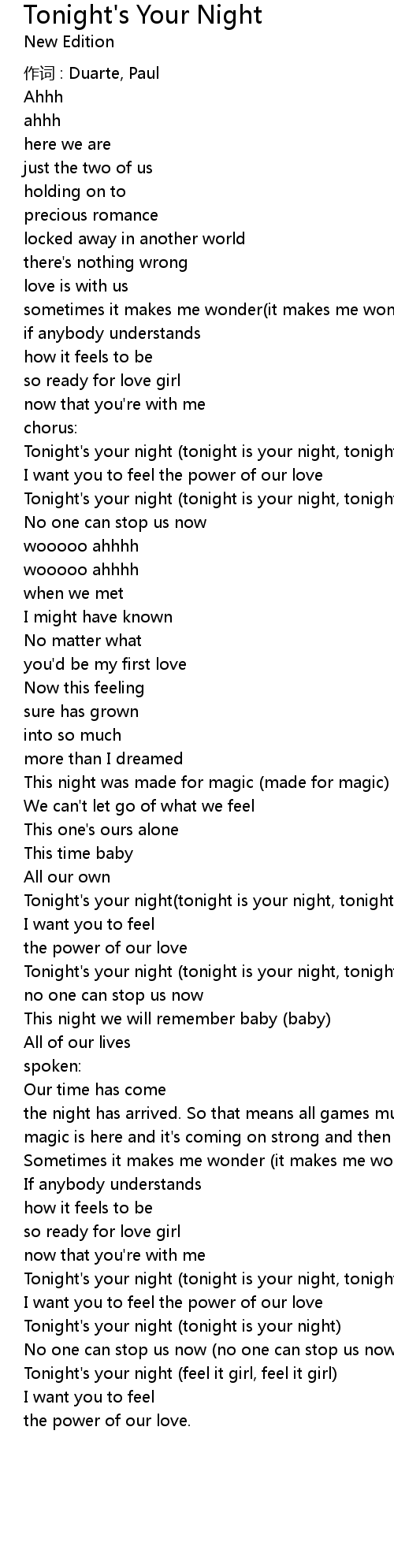 | the night has arrived. So that means all games must be put aside.(put aside) the magic is here and it's coming on strong and then nothing can stop us now. | |