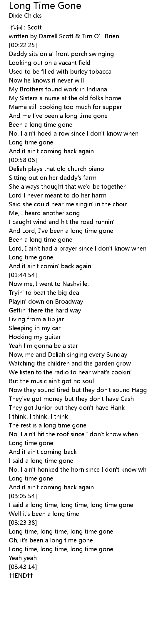 | [03:25.89] | Long time, long time, long time gone |