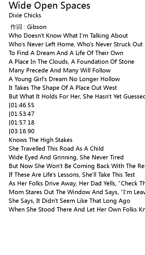 | [02:50.61][01:46.55][01:03.92] | She Needs Wide Open Spaces |