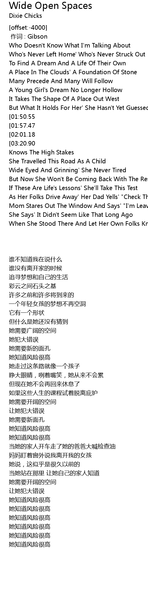 | [02:54.61][01:50.55][01:07.92] | She Needs Wide Open Spaces |