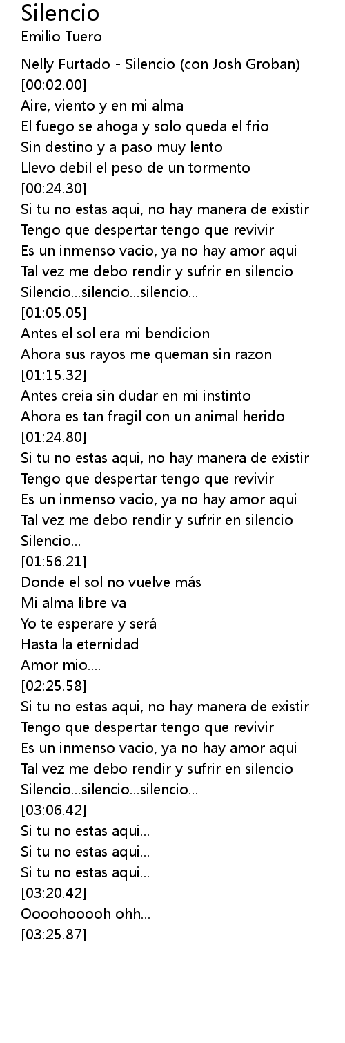 | [00:01.00] | Nelly Furtado - Silencio (con Josh Groban) |