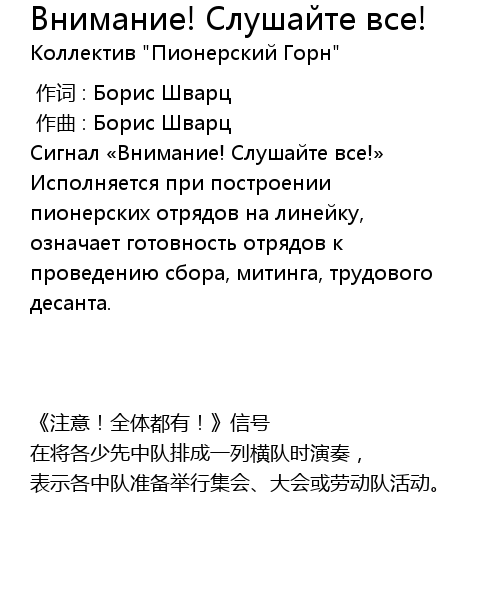 | [00:31.50] | означает готовность отрядов к проведению сбора, митинга, трудового десанта. |