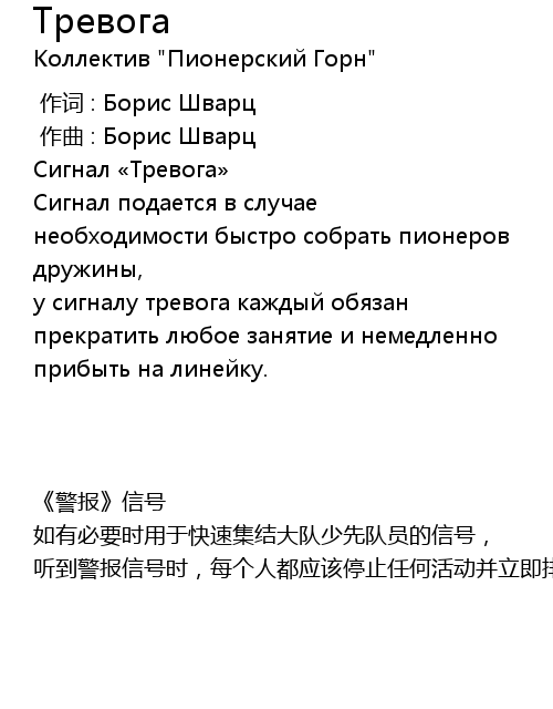| [00:15.50] | Сигнал подается в случае необходимости быстро собрать пионеров дружины, |