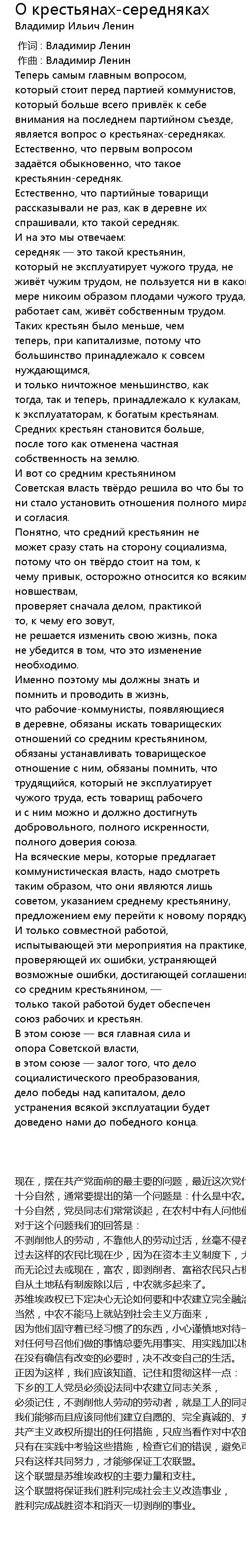 Теперь самым главным вопросом, который стоит перед партией коммунистов, который больше всего привлёк к себе внимания на последнем партийном съезде, является вопрос о крестьянах-середняках. |
