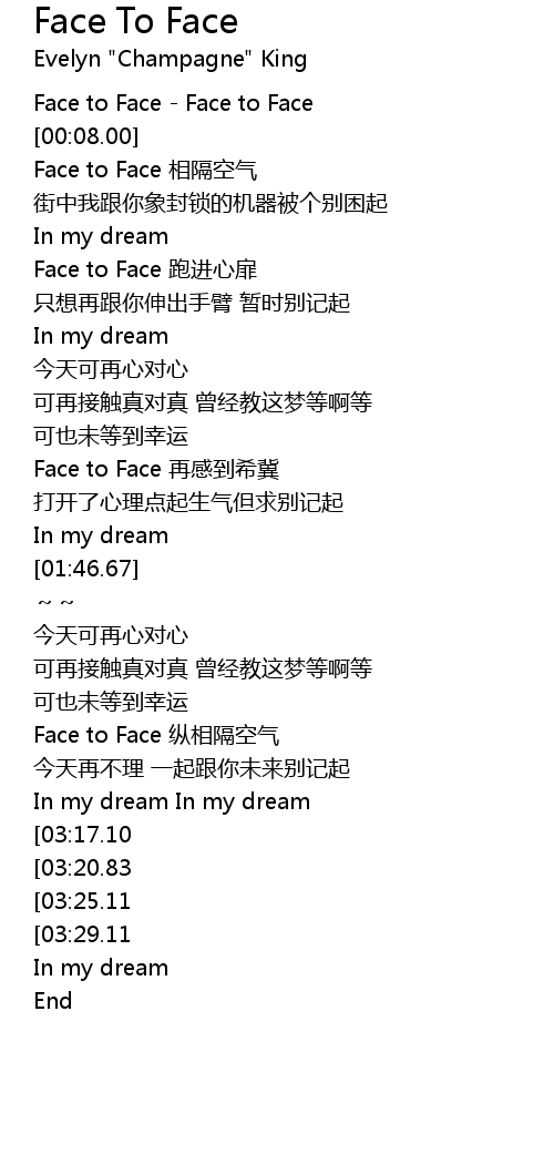 | [03:33.75][03:17.10][02:59.69] | Face to Face 再跑进心扉 |