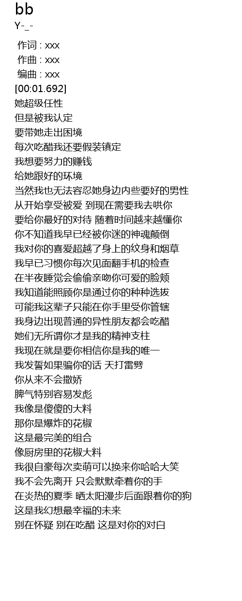 | [01:32.191] | 我身边出现普通的异性朋友都会吃醋 |
