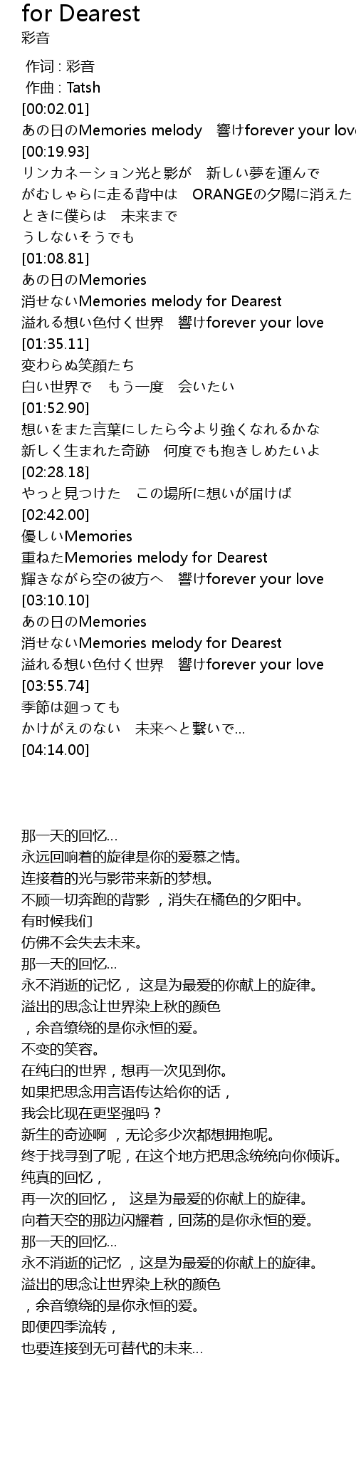 | [02:47.05] | 重ねたMemories melody for Dearest |