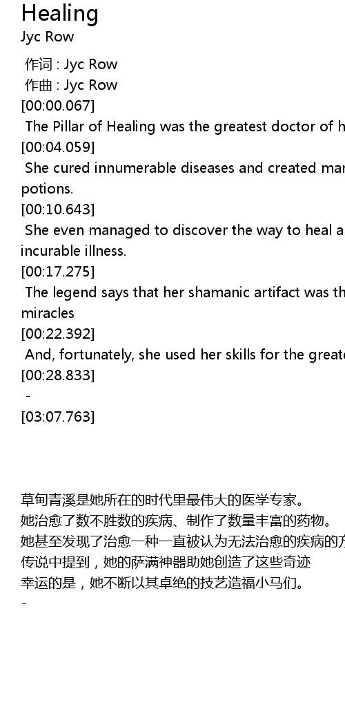 | [00:00.966] | The Pillar of Healing was the greatest doctor of her time. |
