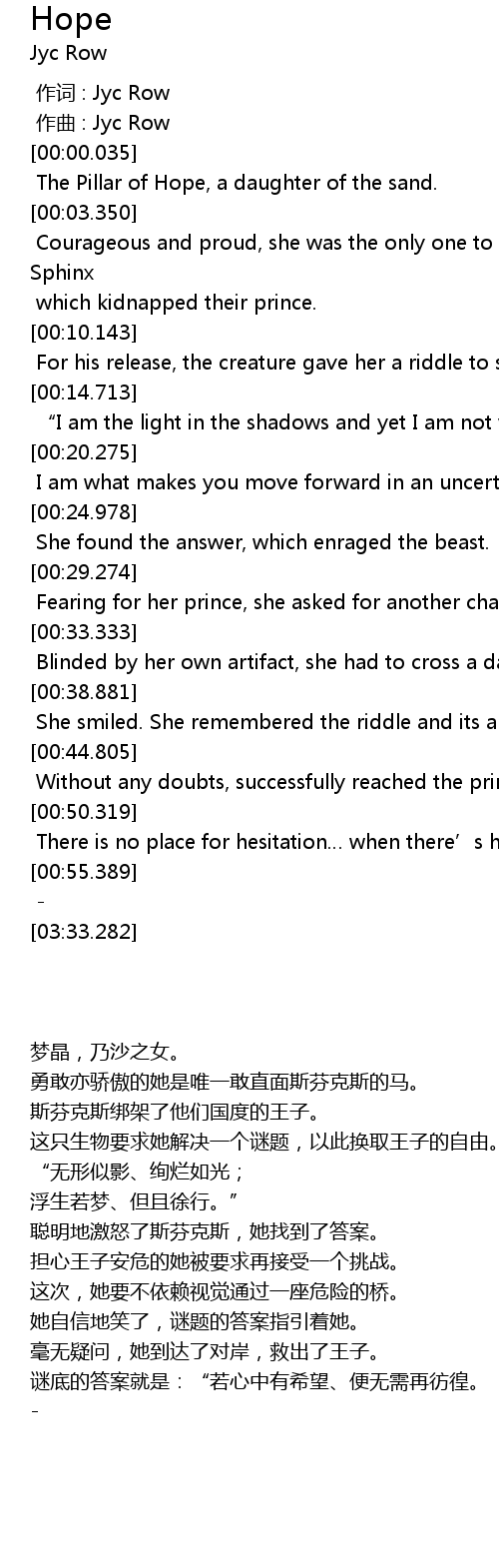 | [00:51.663] | 谜底的答案就是:“若心中有希望、便无需再彷徨。“ |