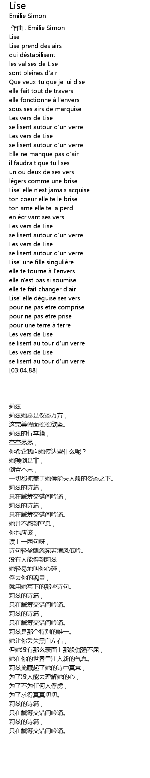 | [02:17.31] | Lise' elle dé guise ses vers |