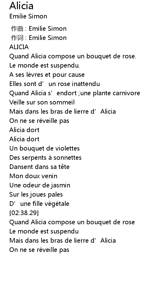 | [02:56.99] | Mais dans les bras de lierre d’Alicia |
