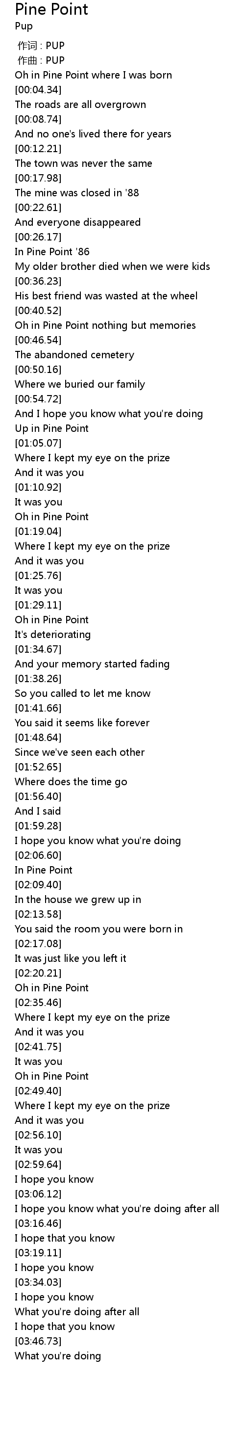 | [02:33.40] | Oh in Pine Point |