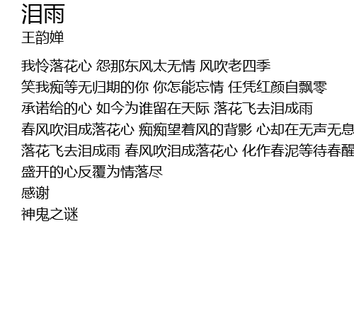 | wǒ lián luò huā xīn yuàn nà dōng fēng tài wú qíng fēng chuī lǎo sì jì xiào wǒ chī děng wú guī qī de nǐ nǐ zěn néng wàng qíng rèn píng hóng yán zì piāo líng chéng nuò gěi de xīn rú jīn wèi shuí liú zài tiān jì luò huā fēi qù lèi chéng yǔ chūn fēng chuī lèi chéng luò huā xīn chī chī wàng zhe fēng de bèi yǐng xīn què zài wú shēng wú xī zhōng suì qù luò huā fēi qù lèi chéng yǔ chūn fēng chuī lèi chéng luò huā xīn huà zuò chūn ní děng dài chūn xǐng shèng kāi de xīn fǎn fù wéi qíng luò jǐn | |