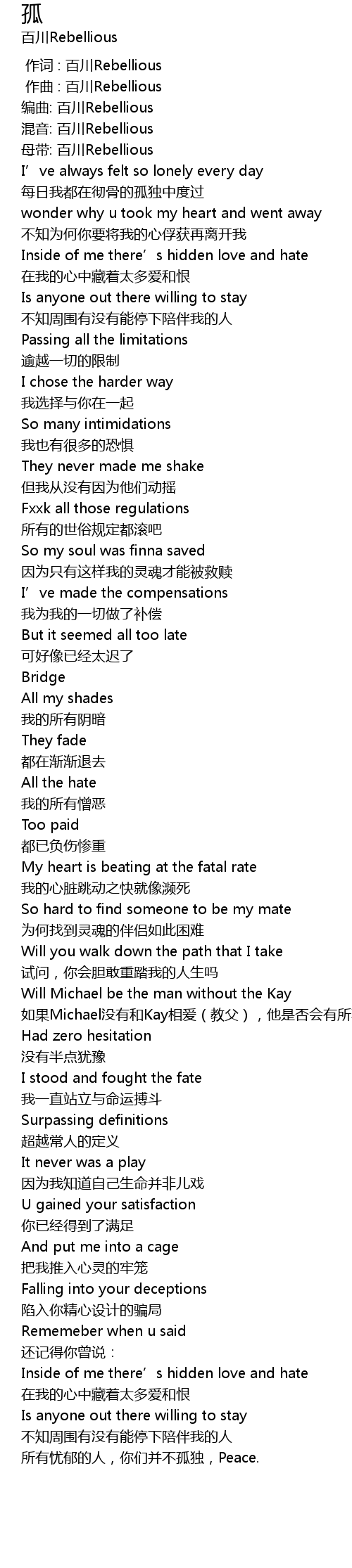 | [00:00.500] | zuò qǔ : bǎi chuān Rebellious |