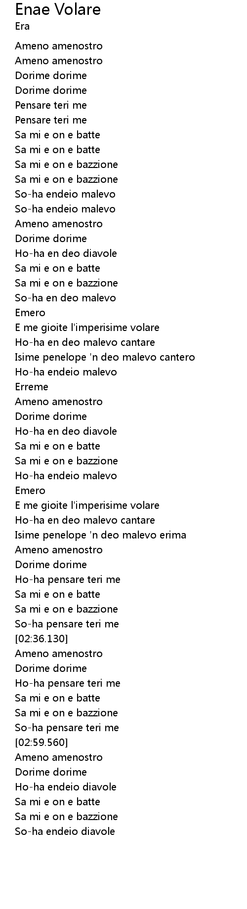 | [03:05.180] | Ho-ha endeio diavole |