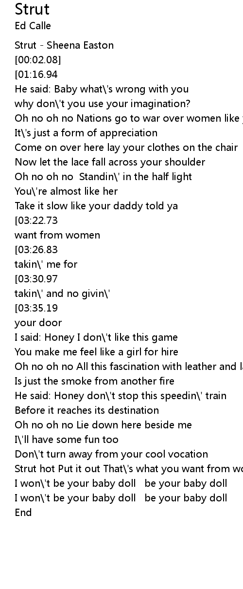| [03:39.77][03:22.73][00:59.11][03:04.90] | Strut hot Put it out That\'s what you want from women |