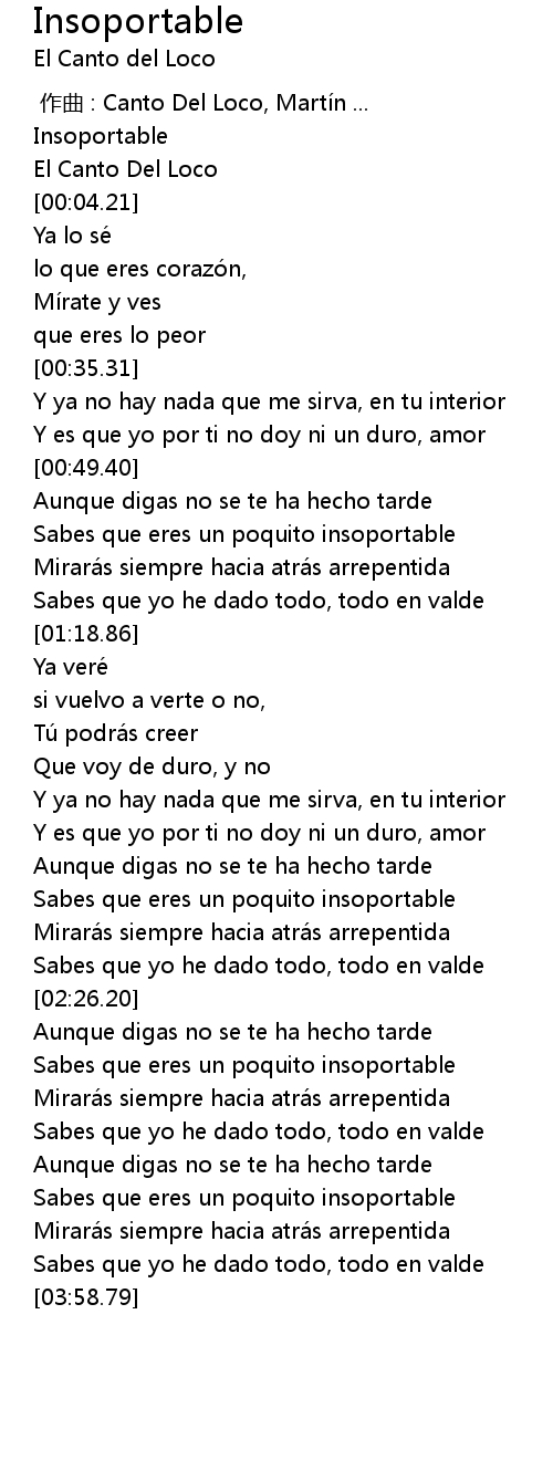| [02:00.36] | Sabes que eres un poquito insoportable |