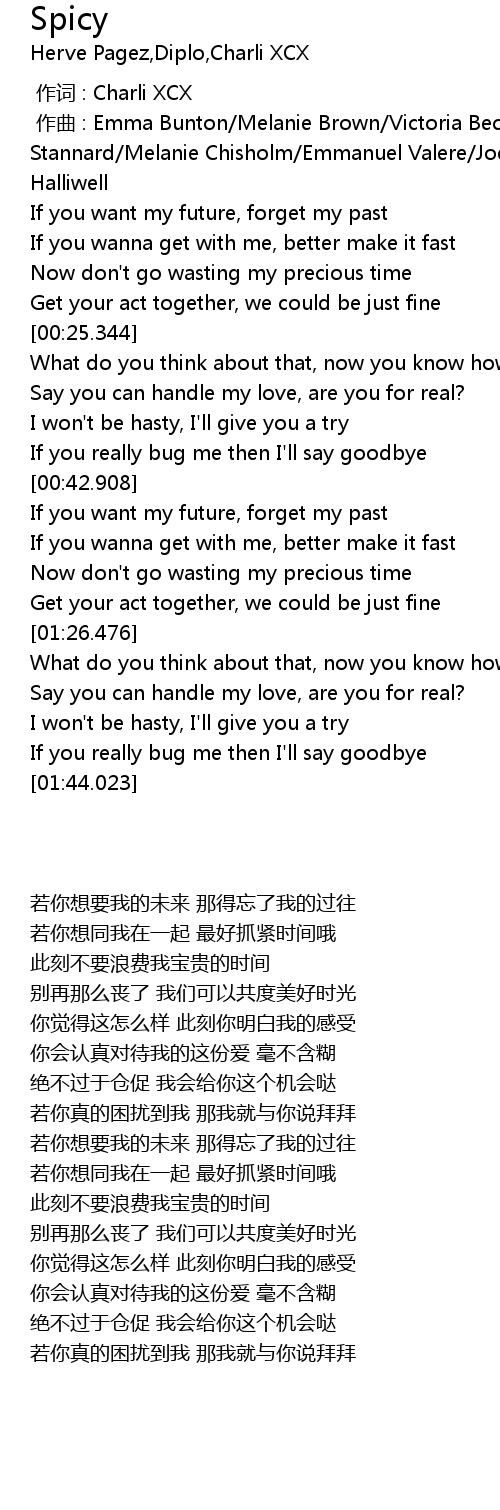 | [00:01.000] | zuo qu : Emma Bunton Melanie Brown Victoria Beckham Richard Stannard Melanie Chisholm Emmanuel Valere Joel Jaccoulet Matthew Rowe Geraldine Halliwell |