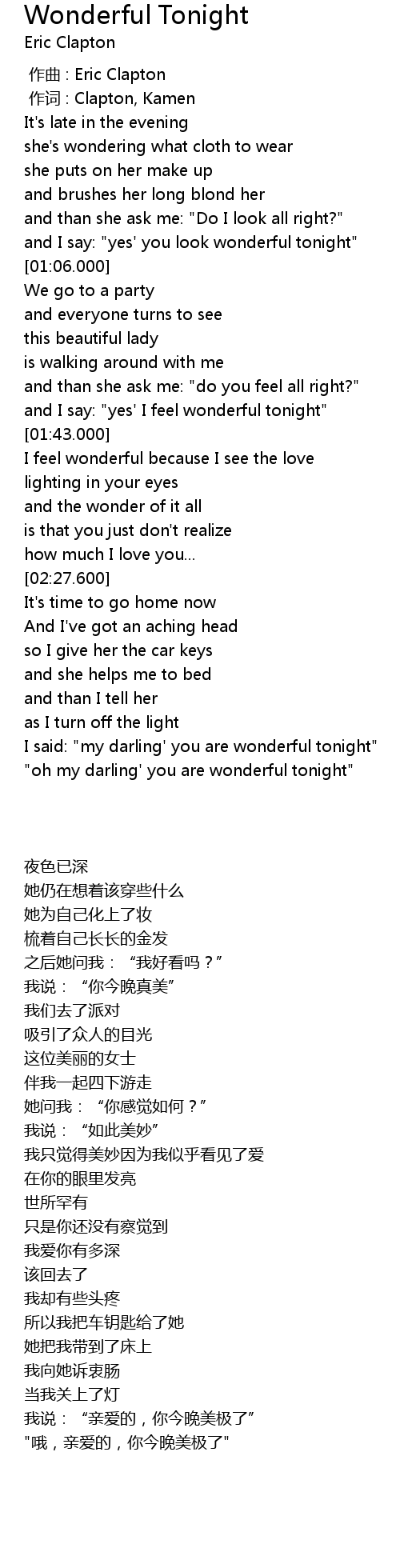 | [02:56.600] | I said: " my darling' you are wonderful tonight" |