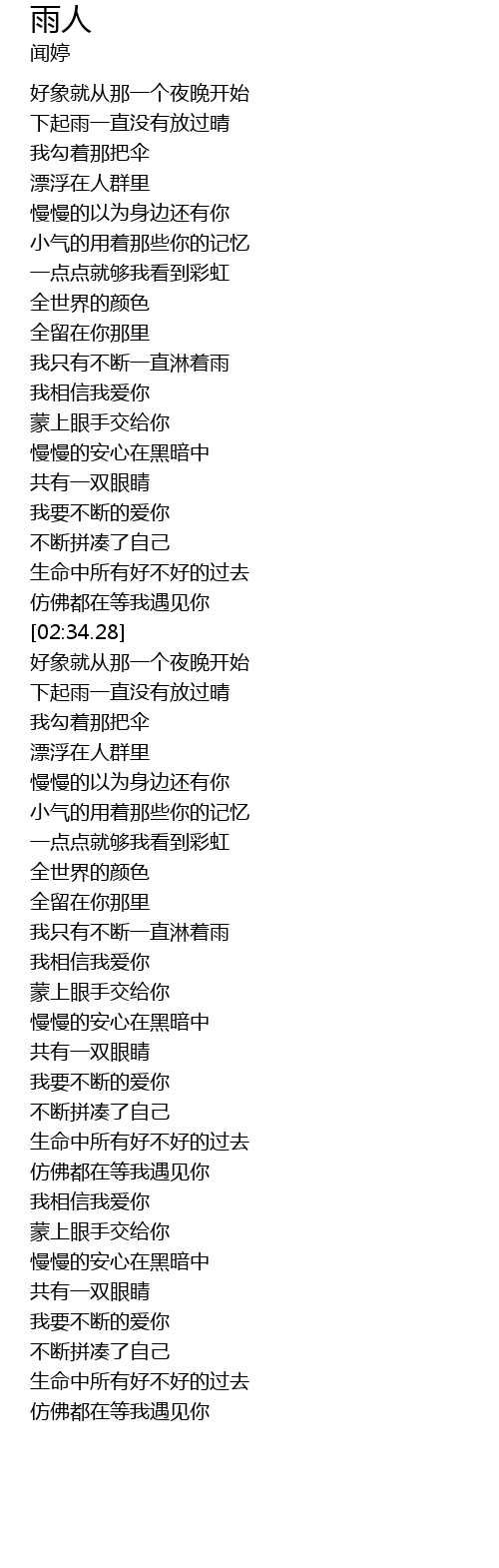 | [01:46.47] | 我只有不断一直淋着雨 |