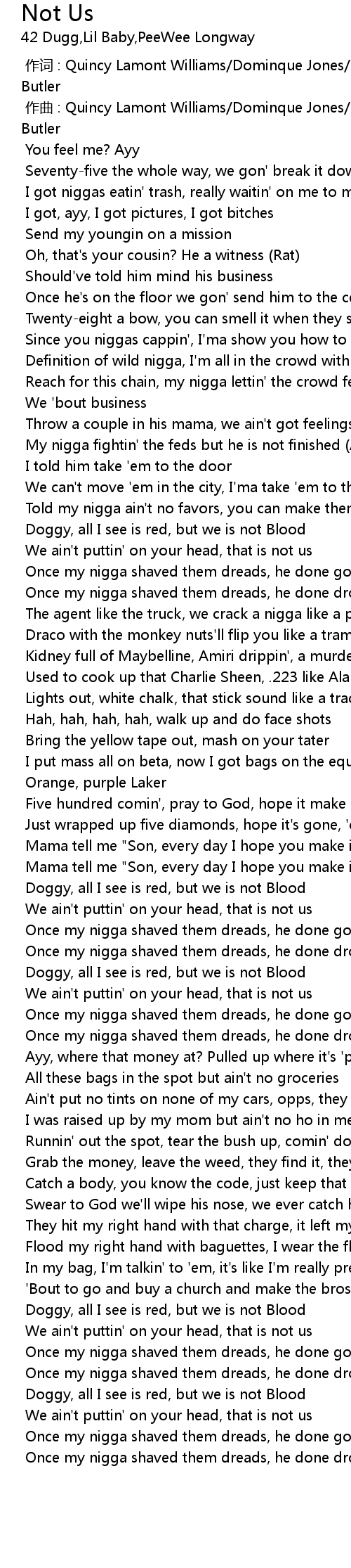 | [01:43.157] | Doggy, all I see is red, but we is not Blood |