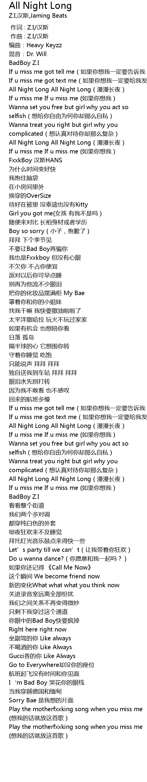 | [03:01.251] | Play the motherfxxking song when you miss me (想我的话就放这首歌) |
