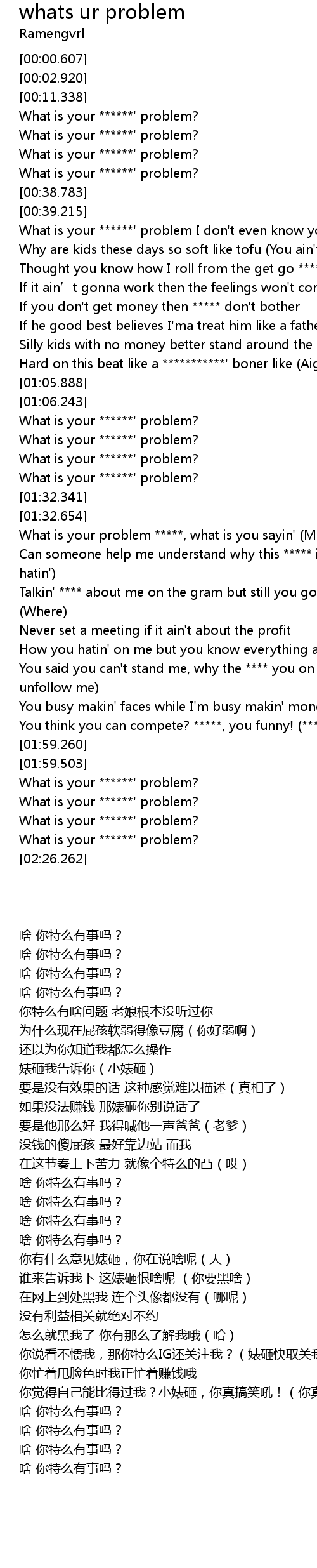 | [01:33.005] | What is your problem , what is you sayin' Man |