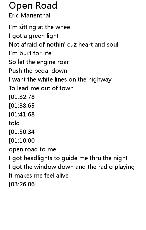 [01:01.52][01:10.00][01:54.06][02:02.13][02:43.38][02:51.55][03:16.09] Life is an open road to me