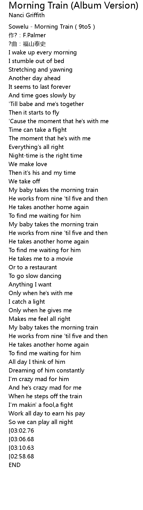 | [00:51.33] | My baby takes the morning train |