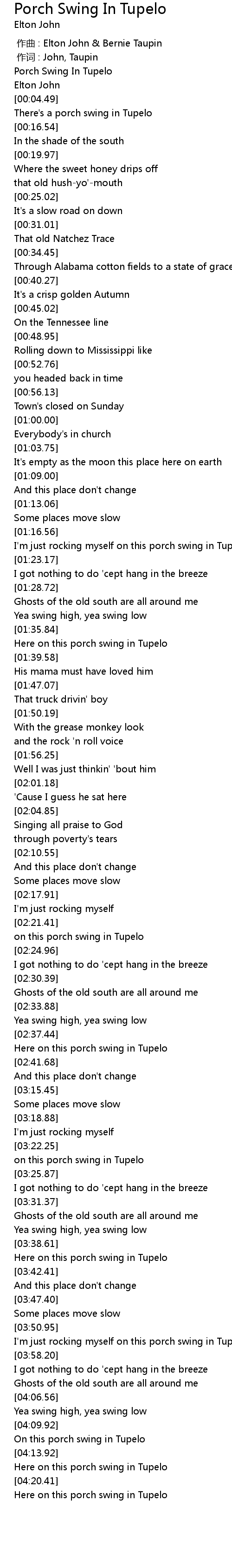 | [00:14.35] | There' s a porch swing in Tupelo |
