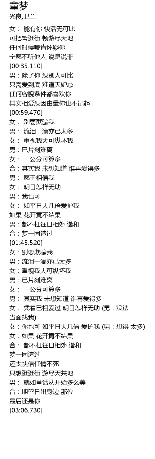 | [02:20.150] | 女:你也可 如平日大几倍 爱护我 (男:想得 太多) |