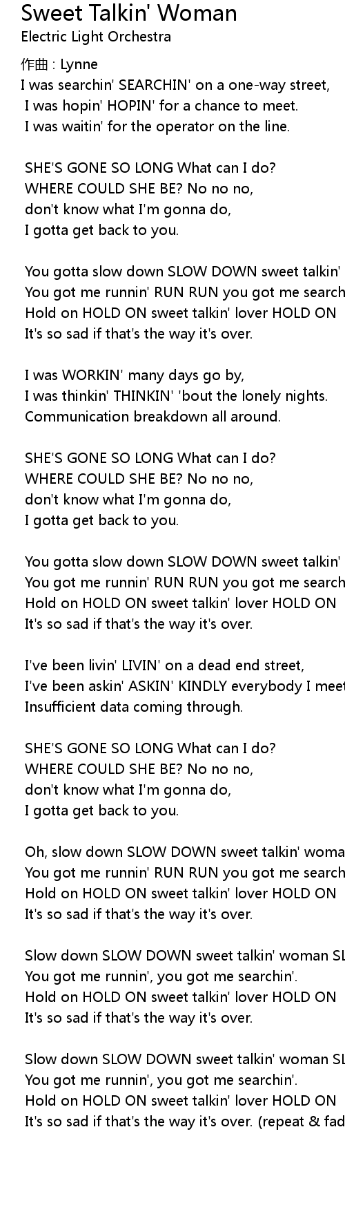 | You gotta slow down SLOW DOWN sweet talkin' woman SLOW DOWN | |