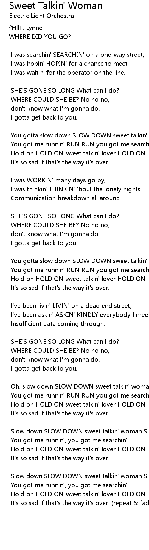 | You gotta slow down SLOW DOWN sweet talkin' woman SLOW DOWN | |