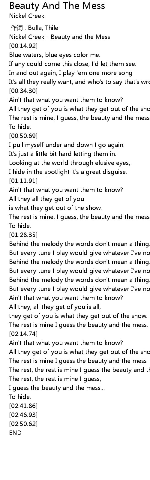 | [00:00.00] | Nickel Creek - Beauty and the Mess |