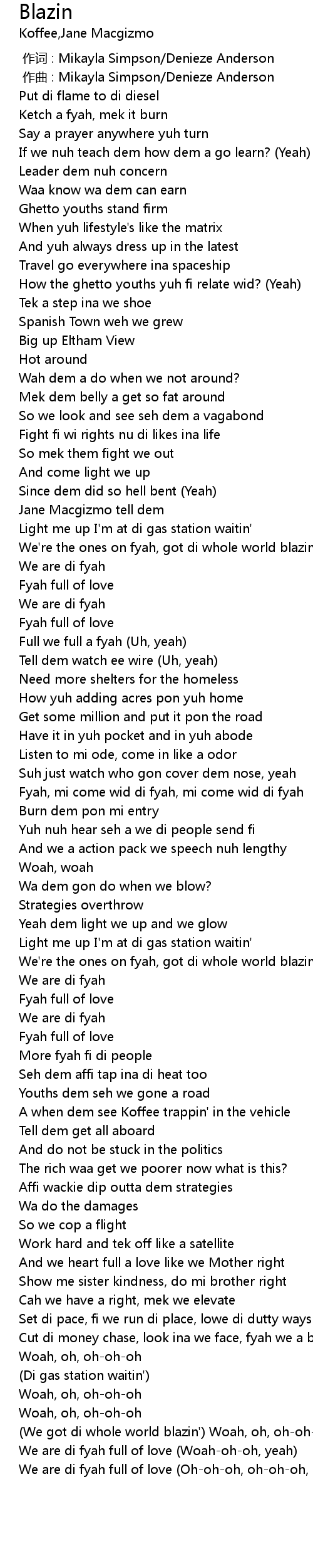 | [02:53.23] | We got di whole world blazin' Woah, oh, ohohoh |