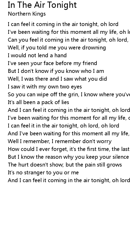 Can you feel it coming in the air tonight, oh lord, oh lord |