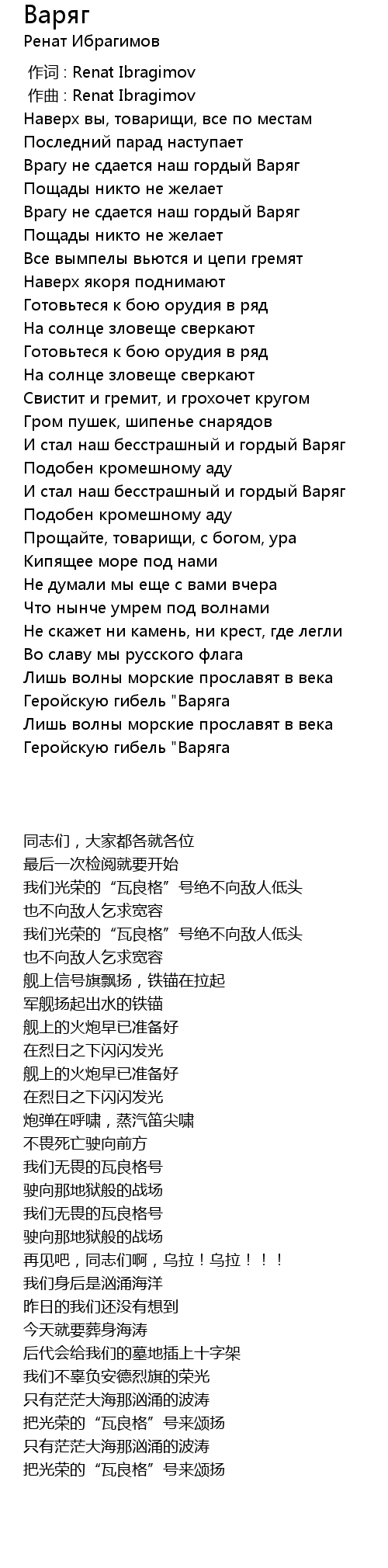 | [01:16] | И стал наш бесстрашный и гордый Варяг |