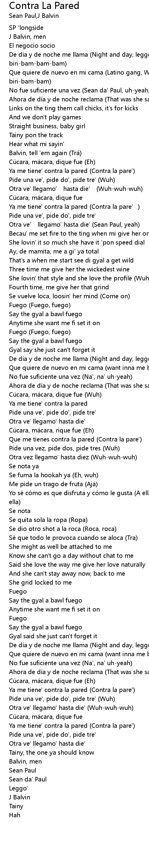 | [00:38.40] | Ya me tiene' contra la pared Contra la pare' |