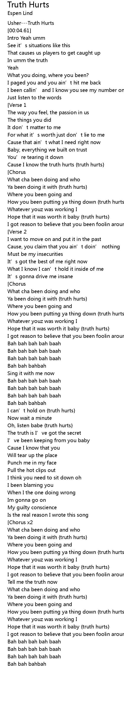 | [01:45.73] | Ya been doing it with {truth hurts} |
