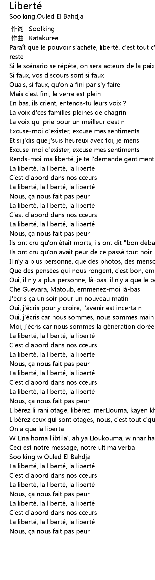 | [00:21.16] | Para t que le pouvoir s' achè te, liberté, c' est tout c' qui nous reste |