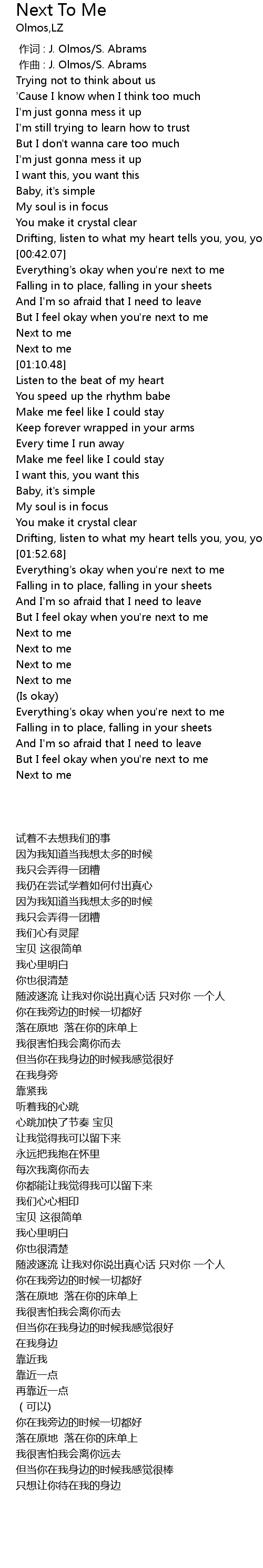 | [00:42.42] | Everything' s okay when you' re next to me |