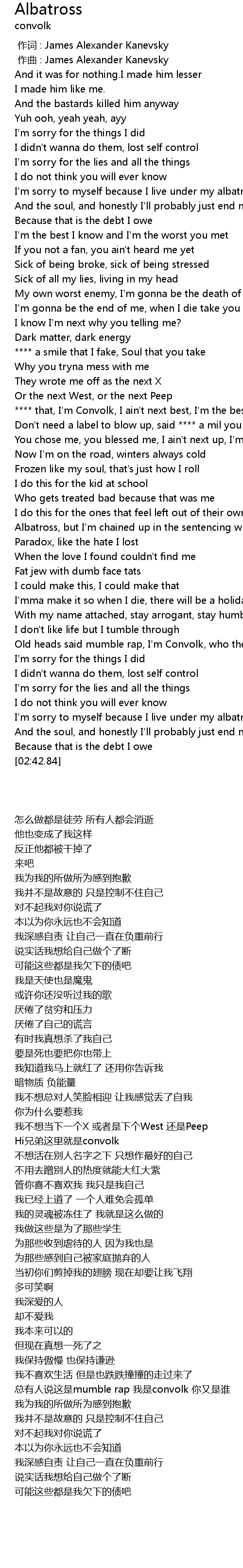 | [02:08.76] | 总有人说这是mumble rap 我是convolk 你又是谁 |