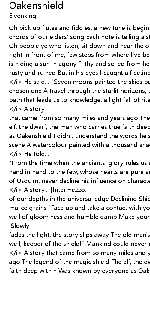 Oh pick up flutes and fiddles, a new tune is beginning A melody forsaken, on the chords of our elders' song Each note is telling a story, a fragment of existence Oh people ye who listen, sit down and hear the old man's story He was standing right in front of me, few steps from where I've been That day the manor's tower is hiding a sun in agony Filthy and soiled from head to feet, his sword was rusty and ruined But in his eyes I caught a fleeting glimpse of his pride [Bridge:]</i> He said... "Seven moons painted the skies before I reached for the chosen one A travel through the starlit horizons, through the magic's way On the path that leads us to knowledge, a light fall of rites and believes from past forgotten times Outshining the malice on our thoughts ! [Chorus:]</i> A story that came from so many miles and years ago The legend of the magic shield The elf, the dwarf, the man who carries true faith deep within Was known by everyone as Oakenshield I didn't understand the words he said, the silence fell on the scene A watercolour painted with a thousand shades of feels A wooden shield tied on his back, the magic wisdom seed From that day on [Bridge:]</i> He told... "From the time when the ancients' glory rules us all, the shield has been passed hand in hand to the few, whose hearts are pure and bold made with the hardwood of Usdu'm, never decline his influence on character outstanding is the power of our will ! [Chorus:]</i> A story... [Intermezzo:]</i> Shield, from the sources of our depths in the universal edge Declining Shield, from the wounds in your malice grains "Face up and take a contact with your inner fears You will find a well of gloominess and humble damp Make yourself a trace on walk, the power of become The enchantment is the magic of being" [Solos: Aydan, Jarpen] Slowly fades the light, the story slips away The old man's tired now: doze off! "Sleep well, keeper of the shield!" Mankind could never understand, the shield remains forever only as a: [Chorus:]</i> A story that came from so many miles and years ago The legend of the magic shield The elf, the dwarf, the man who carries true faith deep within Was known by everyone as Oakenshield |